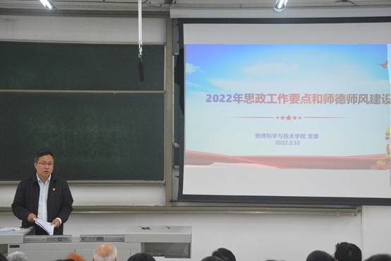 首先,刘玉书记解读了上级相关文件重要精神,从加强师德师风建设的总体要求、全面加强教师队伍思想政治工作、大力提升教师职业道德素养、关于完善高校教师思想政治和师德师风建设工作体制机制等四方面开展宣贯。接着,刘玉书记结合学校2022年工作要点对学院中心工作进行了部署,解读了重点工作的具体内容,并就有关情况进行了进一步说明。