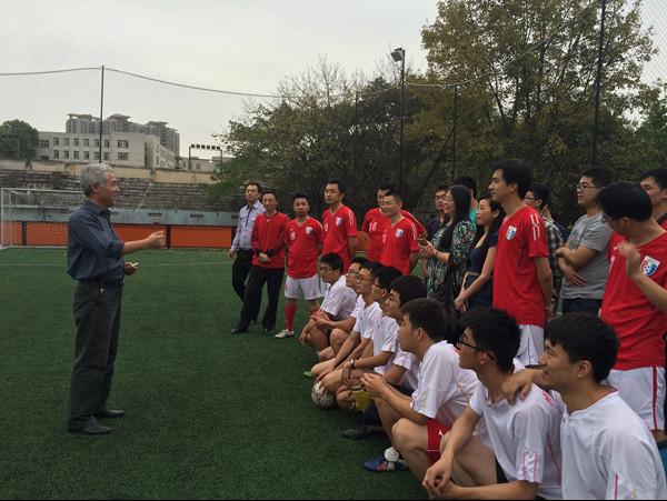 赵勇院长出席了校庆运动会师生足球赛并亲自开球。他在赛前讲话中表示,球员们要发扬友谊第一、比赛第二的比赛精神,团结一致、顽强拼搏,展现我院师生良好的精神风貌,并勉励球员们把足球运动的团队合作精神带入科研团队中去,更好地搞好科研与学习。物理学院副书记蒋佳在开幕式上致开幕词,她表示此次举办师生运动赛有利于强健师生体魄,丰富校园文化生活,推进研究生素质教育,带动和发展其他群众性体育运动。学院工会主席刘静沂老师致词,认为此次活动很有意义,学院工会在经费上给予有力支持,希望该活动能成为广大师生相互交流沟通和展示自我风采的平台,在倡导我院师生积极锻炼身体之时,展现物理学院师生青春活力风采。